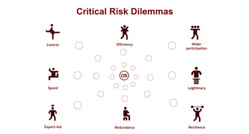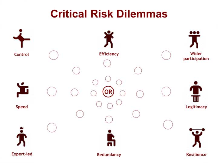 Moving to a more adaptive risk management approach raises some critical dilemmas. Should society acknowledge the need for resilience and redundancy, they will have to forgo their current emphasis on control and efficiency. The diagram above sets out the key trade–offs that have to be made, and each scenario has made different choices, depending on the focus of risk. These choices, described within each scenario, are very different, and their outcomes will reflect these decisions. How successful they will be at dealing with the new emerging paradigm of risk remains to be seen – there is no perfect solution.